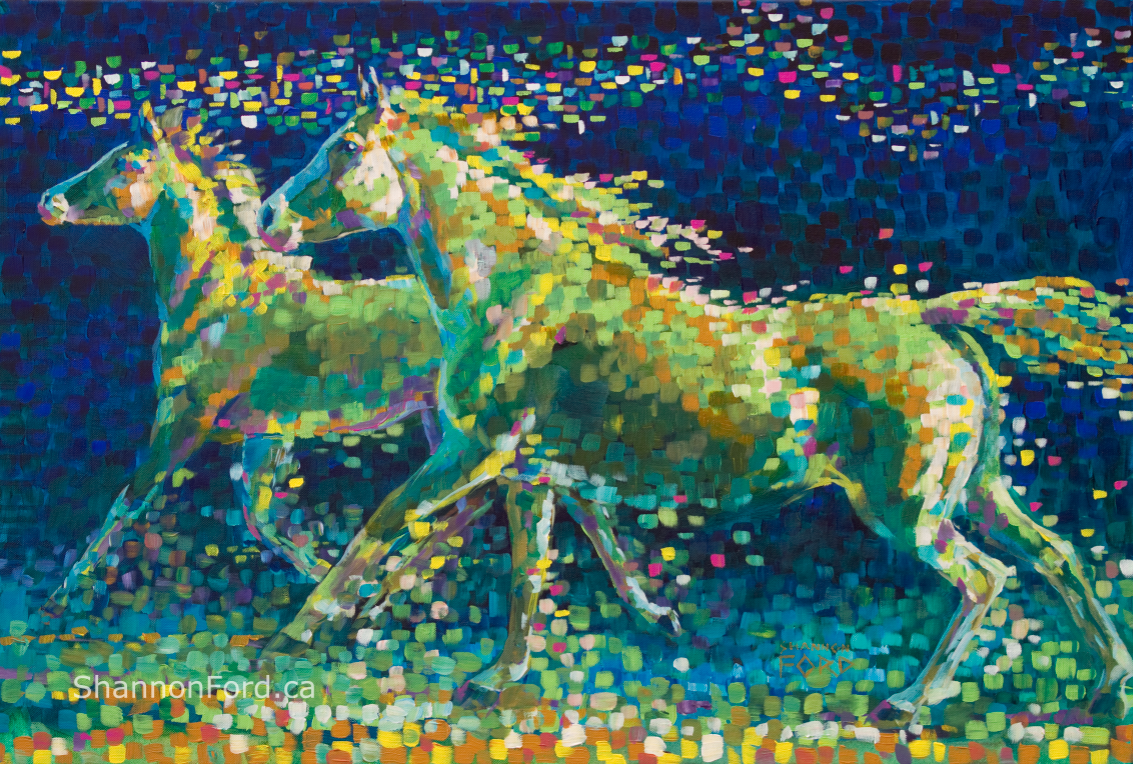 This is another painting inspired by the beautiful Fairview Arabians. This mare and foal have such a lovely essence, and to watch them together was really fun... we watched this foal grow up into a real show-off! His self confidence and beauty were fun to paint!I kept him behind his Mom, but stepping out in front of her to express his emergence into his own being.